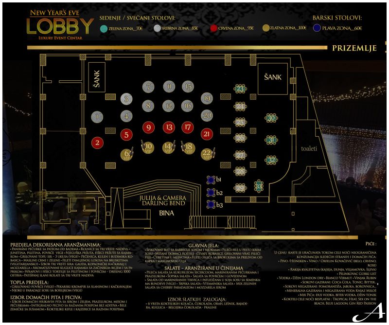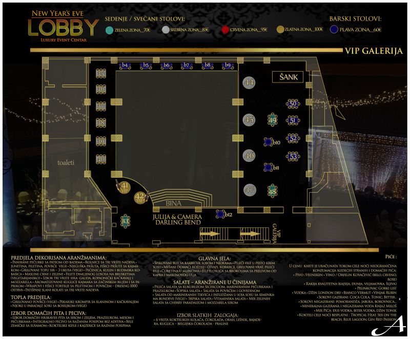 Sedenje/svečani stolovi: Plava zona - 60€ Zelena zona - 70€ Srebrna zona - 85€ Crvena zona - 95€ Zlatna zona - 100€ (flaša viskija Chivas regal za popunjen ceo sto)