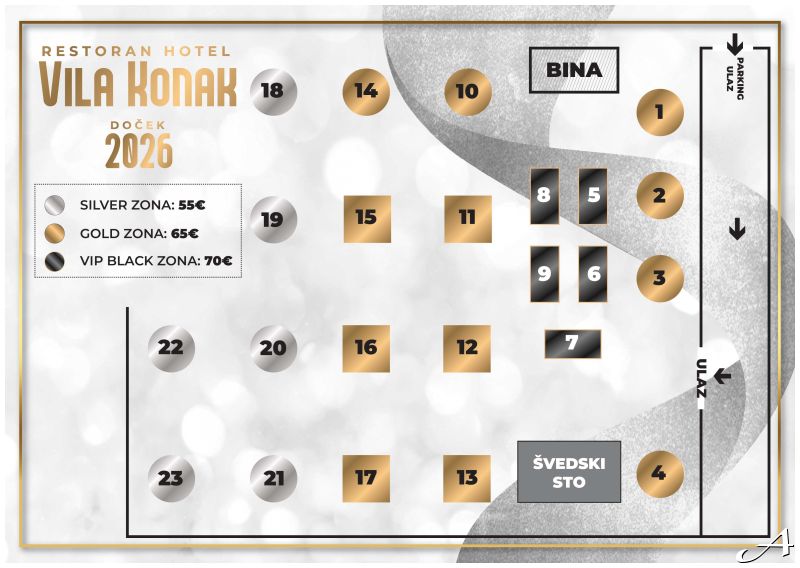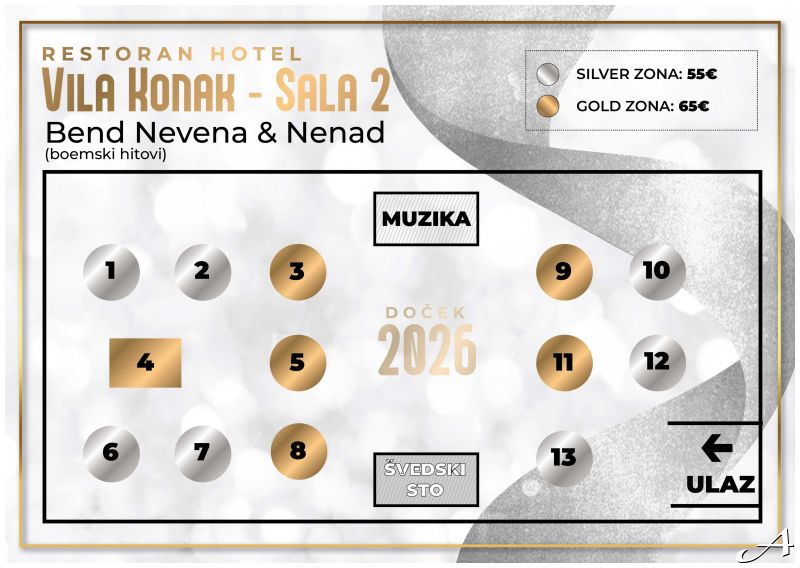 Sala 2 je podeljena u dve zone: Silver zona - 55€ Gold zona - 65€